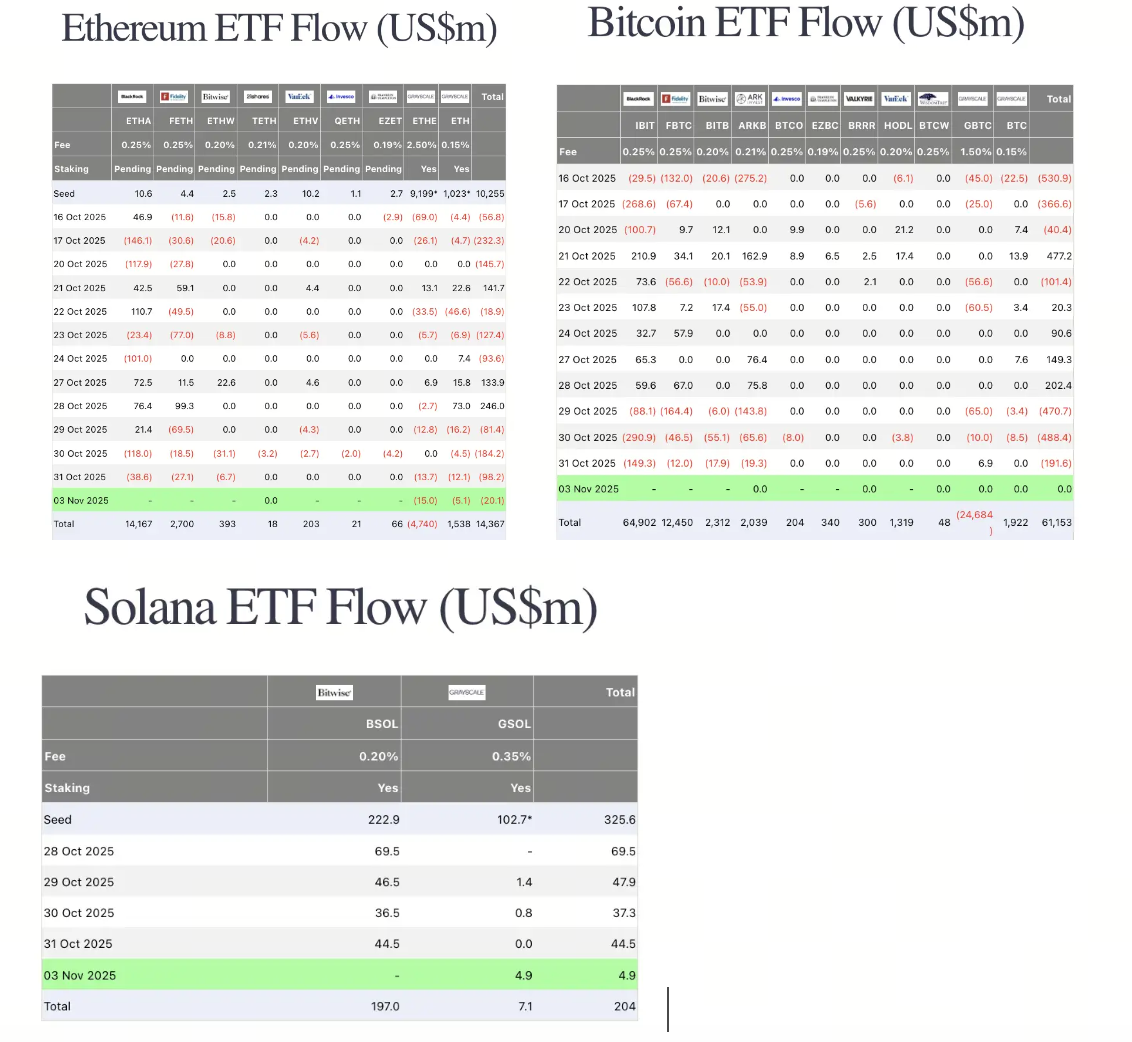 Dane ETF pokazały stłumioną aktywność: netto przepływy BTC ETF pozostały na poziomie zerowym, ETH ETF zanotował odpływ 20,1 mln USD, podczas gdy Solana ETF zarejestrował skromny napływ 4,9 mln USD, odzwierciedlając stałą rotację inwestorów w kierunku ekspozycji na altcoiny.