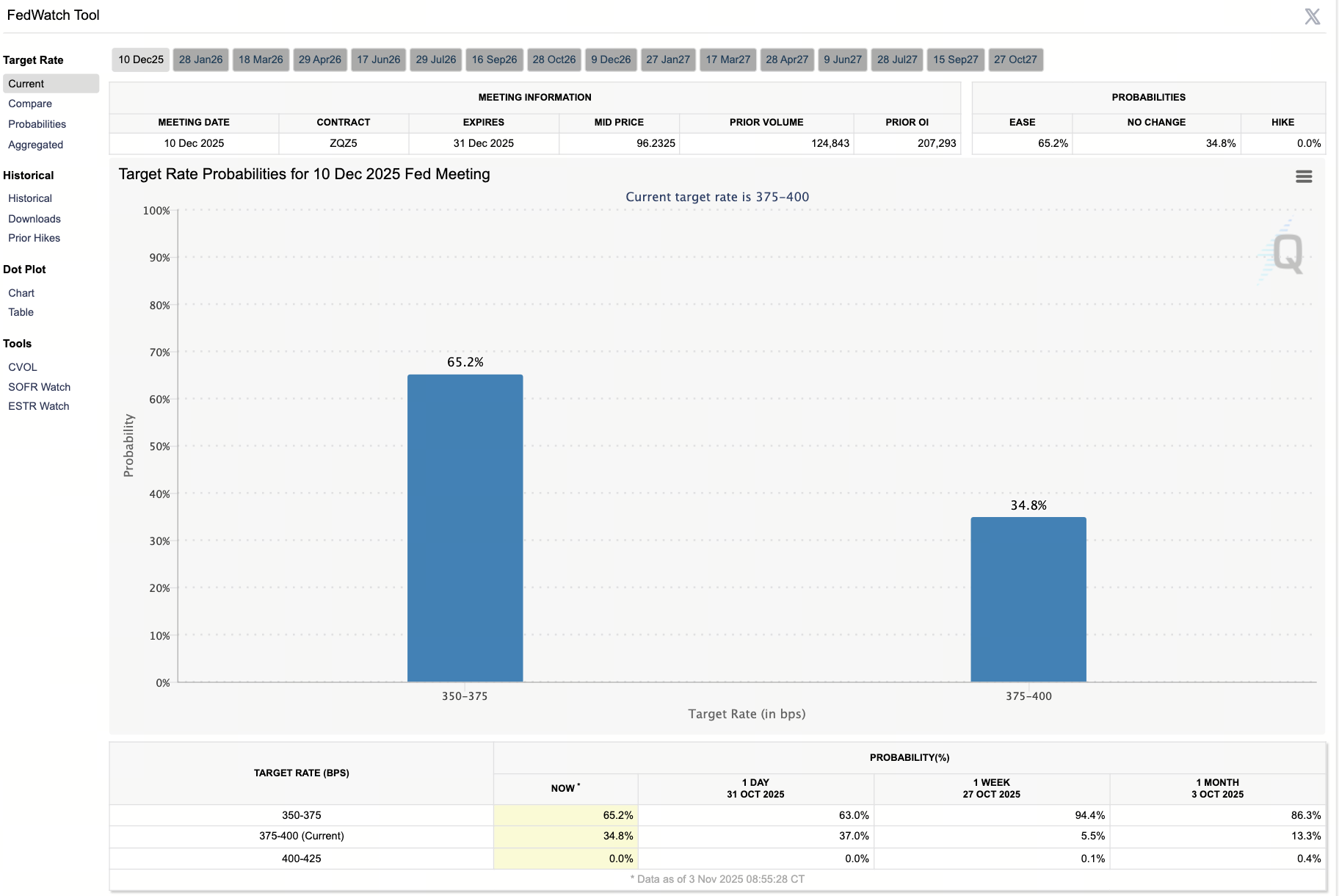 Zgodnie z CME FedWatch, rynek obecnie wycenia 65,2% prawdopodobieństwo obniżki stóp procentowych na następnym spotkaniu.
