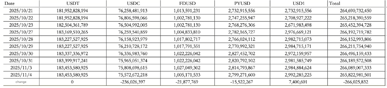 Przepływy stablecoinów stały się negatywne, z netto odpływem 266,03 mln USD 4 listopada. Samo USDC zanotowało odpływy w wysokości 236,03 mln USD, co obniżyło całkowitą kapitalizację stablecoinów do 265,82 mld USD. Historycznie, takie odpływy mają tendencję do opóźniania reakcji cenowych o kilka dni, co sugeruje krótkoterminową miękkość warunków płynności.