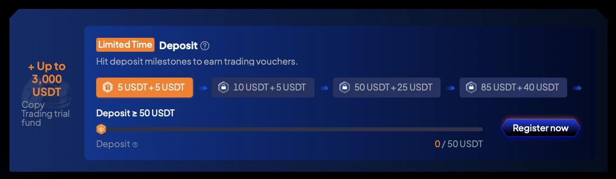 Na najwyższym poziomie pakiet nagród obejmuje 3 000 USDT w pakietach voucherów, 2 500 USDT w środkach próbnych Copy Trading oraz 500 USDT bonusu. Nagrody na niższych poziomach są również atrakcyjne, co sprawia, że kampania jest dostępna nawet dla tych, którzy nie zaczynają od najwyższego progu.
