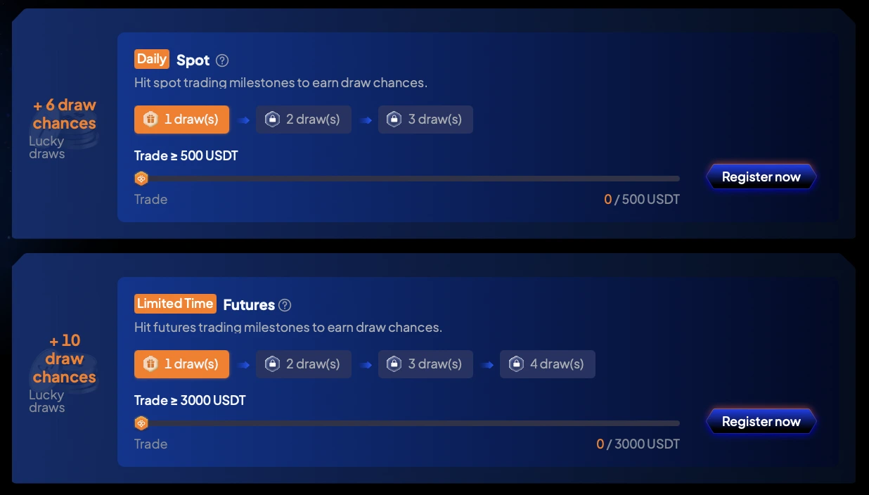 Po wpłacie ponad 50 USDT uczestnicy mogą wykonywać zadania handlowe na rynku spot i futures, aby zdobywać szanse na losowanie gwarantowanych nagród. Zadania spot zaczynają się od 500 USDT, 3 000 USDT i 10 000 USDT wolumenu handlowego, natomiast zadania futures zaczynają się od 3 000 USDT i sięgają do 100 000 USDT.