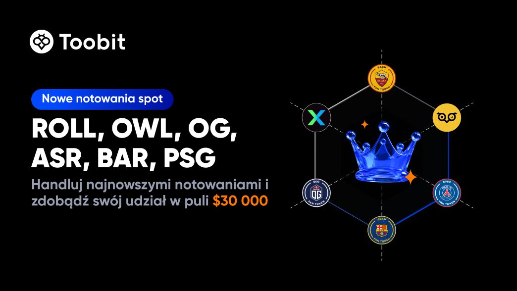 ROLL, OWL, OG, ASR, BAR, PSG oficjalnie pojawiły się na Toobit, a my świętujemy to w wielkim stylu. Dołącz do naszej ekskluzywnej kampanii handlowej i zgarnij swoją część z puli nagród o wartości 30 000 USD, w tym 10 000 USDT w bonusach i 20 000 USD w airdropach tokenów.