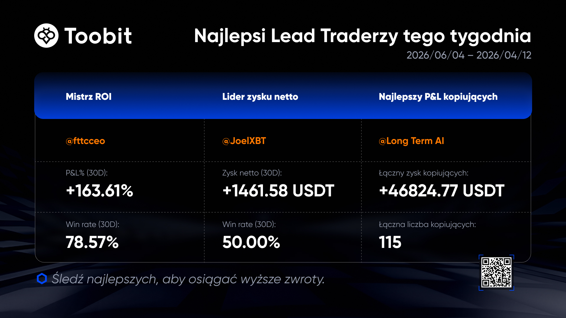 W tym tygodniu trzech Głównych Traderów osiągnęło wyjątkowe wyniki w ciągu ostatnich 30 dni. To sprawdzeni profesjonaliści, a nie szczęśliwe trafy. Obserwuj ich, aby handlować mądrzej i uczyć się od najlepszych.
