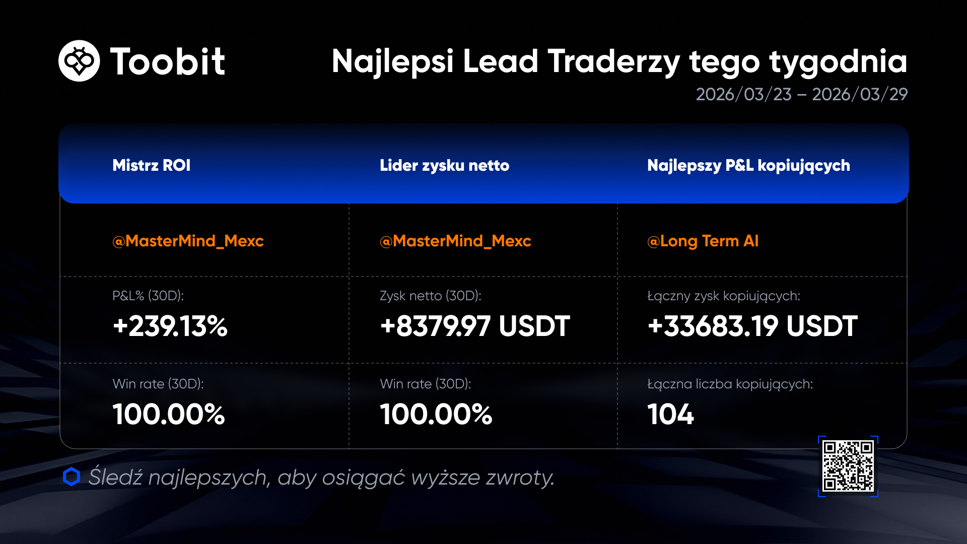 W tym tygodniu trzech Głównych Traderów osiągnęło wyjątkowe wyniki w ciągu ostatnich 30 dni. To sprawdzeni profesjonaliści, a nie przypadkowe wybory. Śledź ich, aby handlować mądrzej i uczyć się od najlepszych.