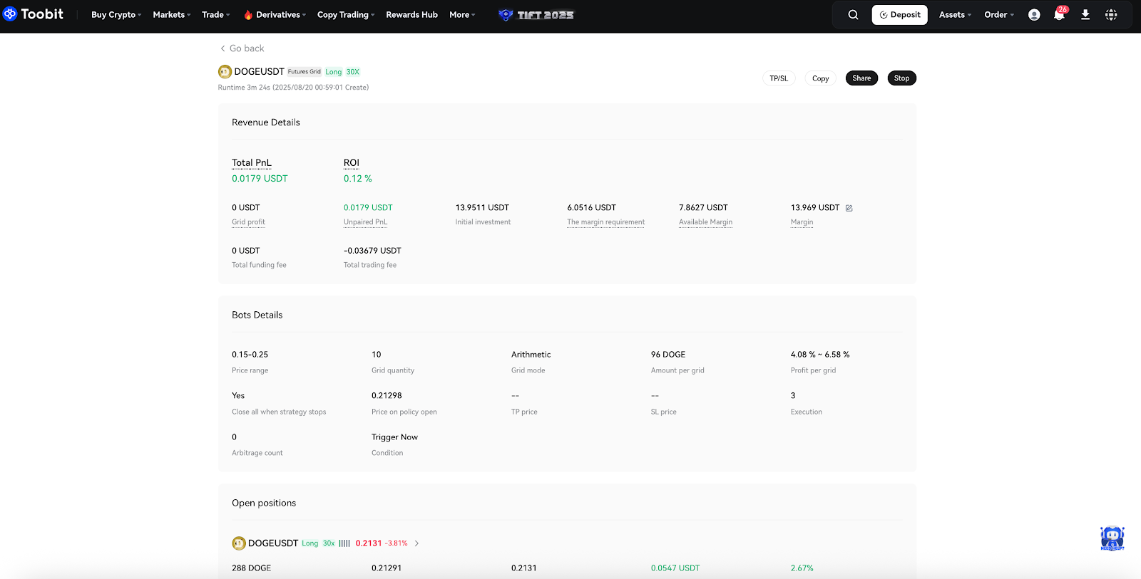 Możesz także dostosować kwotę inwestycji lub dodać TP/SL do swojej pozycji w szczegółach. Uwaga: dodatkowa inwestycja służy jedynie do utrzymania pozycji i uniknięcia likwidacji. Nie resetuje parametrów Grid Bot.