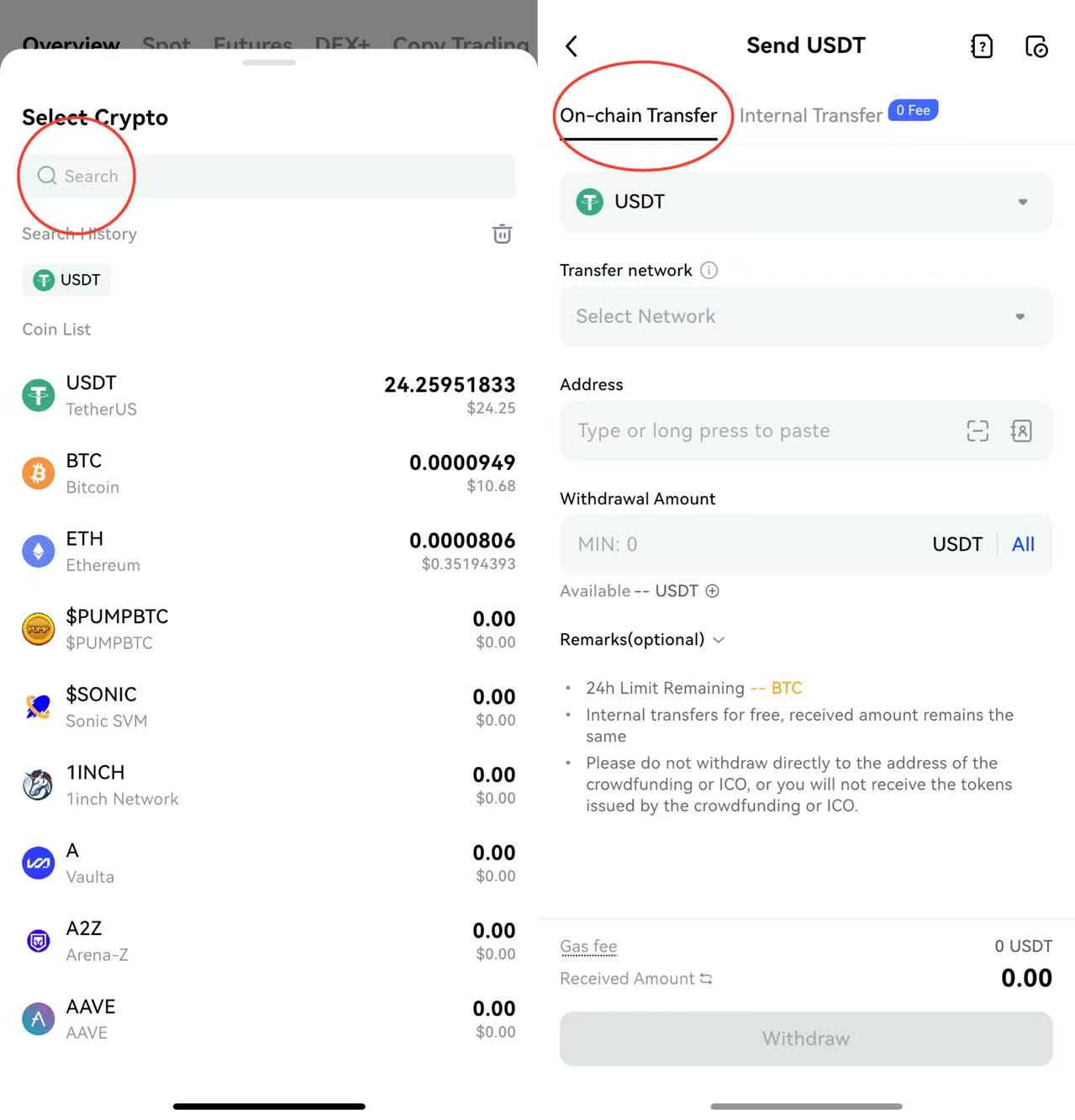 Wybierz walutę, a następnie [On-chain transfer] (przelew on-chain) lub [Internal transfer] (przelew wewnętrzny).