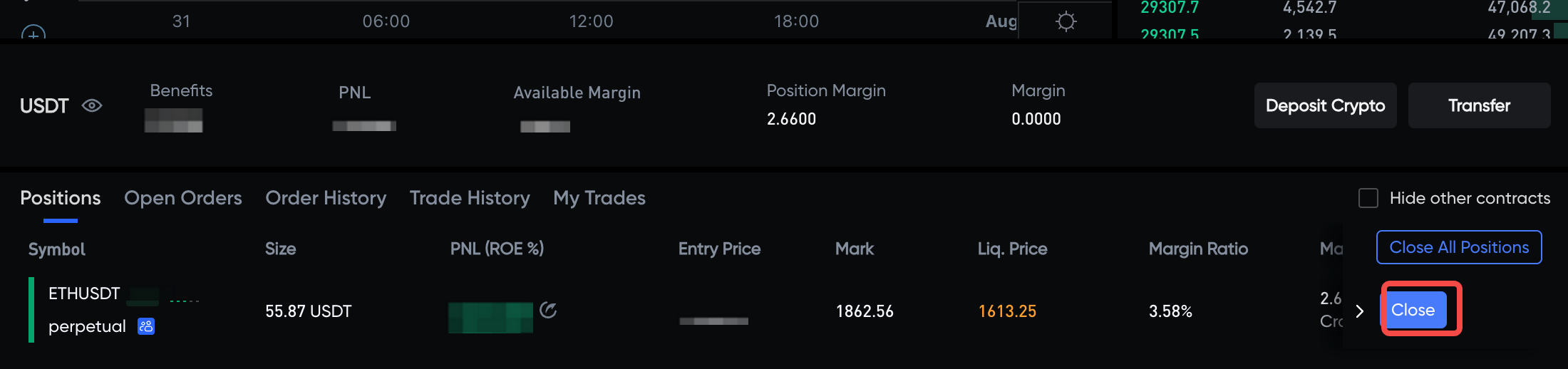 Obecnie Lite Perpetual obsługuje zamykanie pozycji tylko za pomocą interfejsu pozycji. Proszę zapoznać się z poniższym zrzutem ekranu, aby zobaczyć, jak zamknąć pozycję za pomocą interfejsu pozycji w Lite Perpetual.