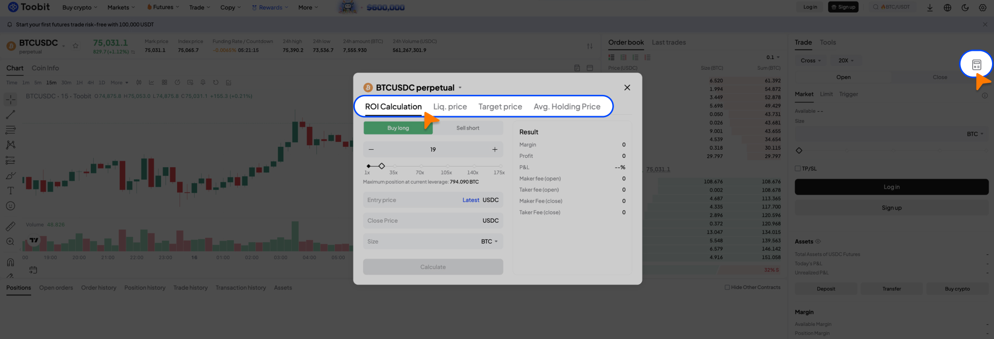 Użytkownicy mogą korzystać z kalkulatora futures, aby oszacować wyniki realizacji zleceń. Kalkulator futures Toobit wspiera kluczowe metryki handlowe, takie jak ROI, cena likwidacji, cena docelowa i średnia cena zakupu, pomagając użytkownikom zarządzać pozycjami, oceniać ryzyko i planować strategie handlowe.