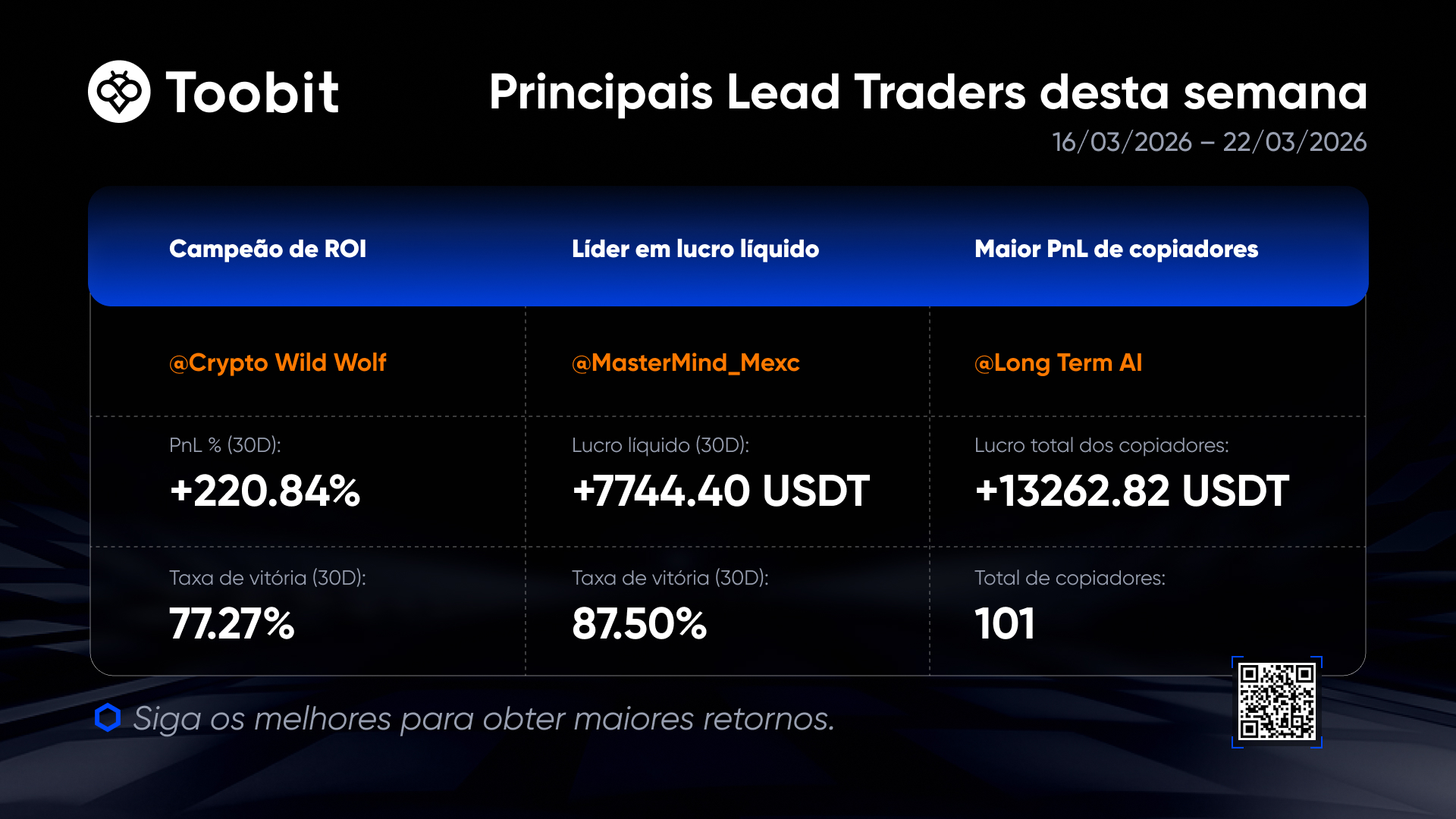 Esta semana, três Traders Líderes apresentaram um desempenho excecional nos últimos 30 dias. Eles são profissionais comprovados, não escolhas de sorte. Siga-os para negociar de forma mais inteligente e aprender com os melhores.