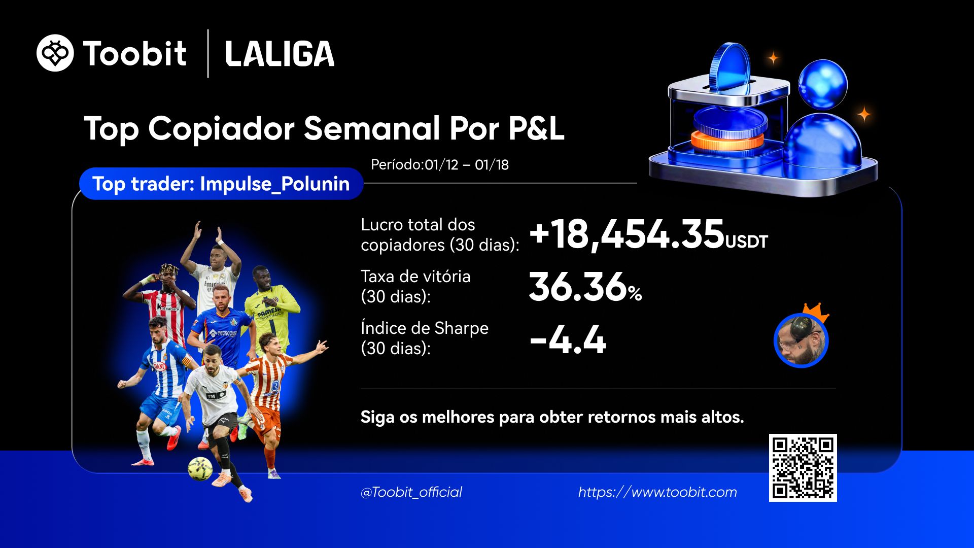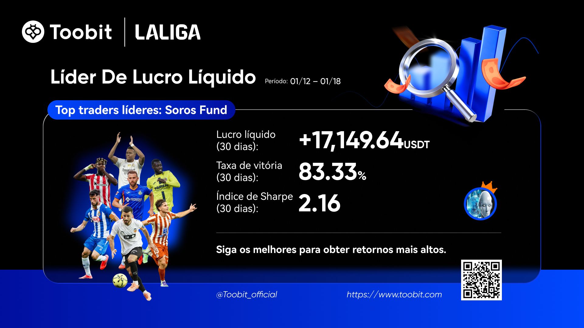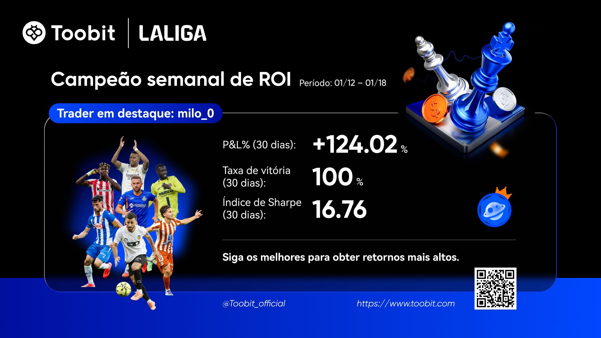 Para ajudá-lo a tomar decisões informadas no nosso ecossistema de Copy Trading, lançámos o nosso Quadro de Líderes de Traders da Semana. Com base em dados dos últimos 30 dias, avaliamos os traders em 3 dimensões principais: ROI, lucro líquido e ganhos dos copiadores.