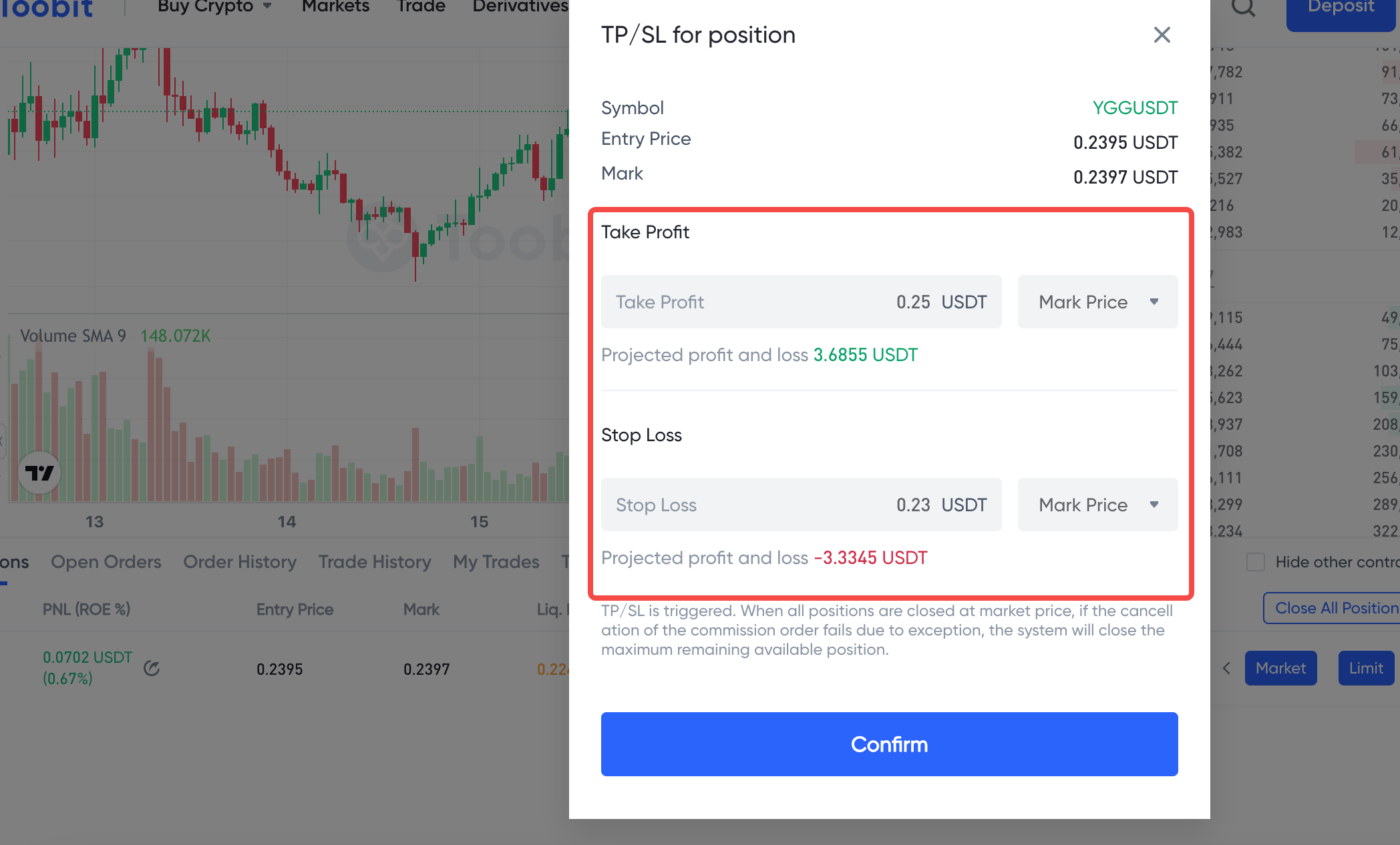 Definir uma ordem de lucro e stop-loss para uma posição existente: O usuário pode definir uma ordem de lucro ou stop-loss para uma posição específica ou definir ambos ao mesmo tempo. Quando o preço mais recente/marcado atingir as condições de disparo, o sistema realizará um pedido limite de fechamento de posição com preço e quantidade predefinidos no mercado.