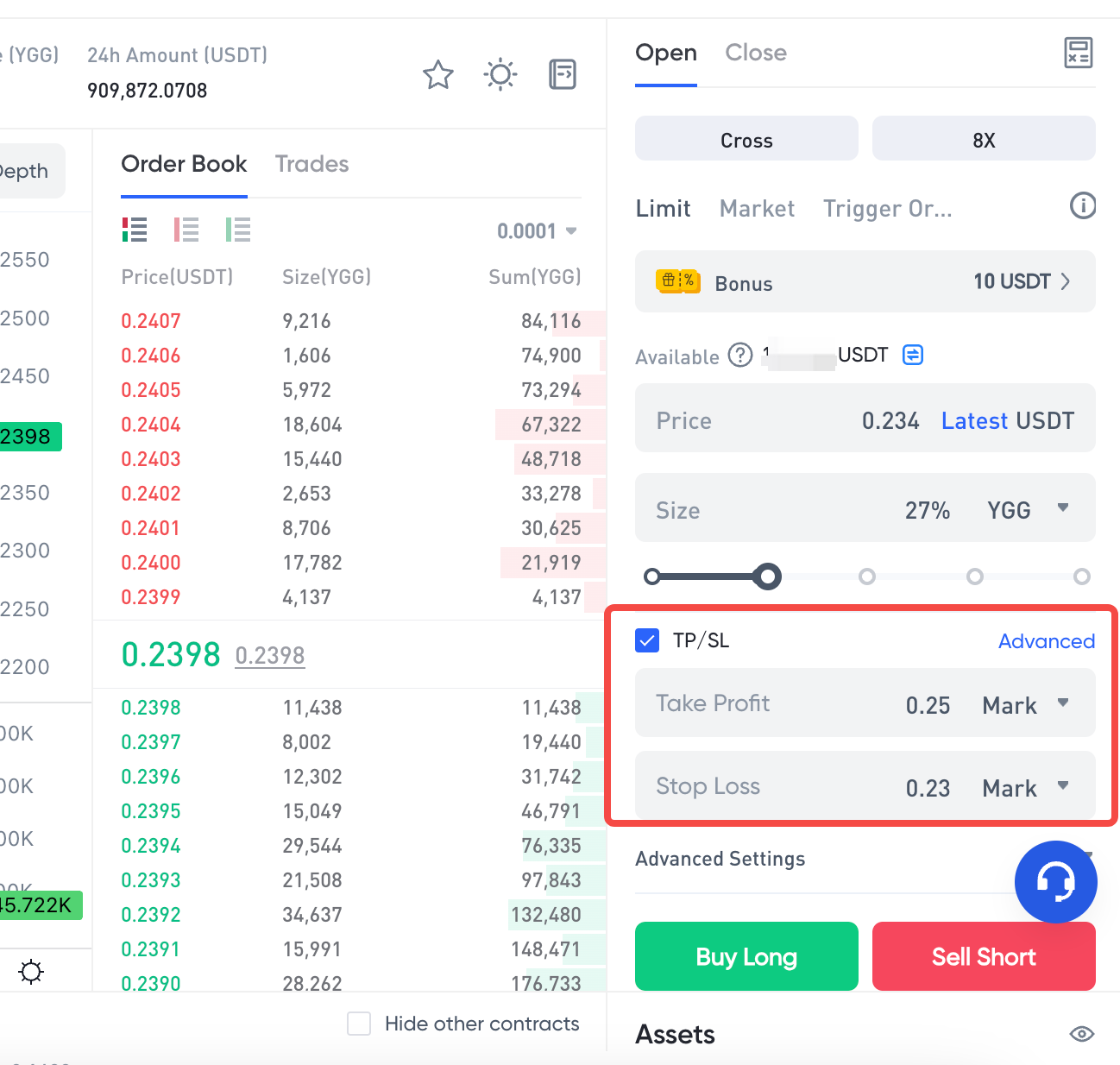 Se o usuário fizer um pedido de "Comprar Longo" utilizando uma ordem disparadora, com um preço de disparo de 23.800 USDT, preço da ordem de 23.750 USDT e quantidade da ordem de 0,2 BTC, a ordem será disparada somente quando o preço mais recente atingir 23.800 USDT e será inserida ao preço fixado de 23.750 USDT com quantidade de 0,2 BTC. A ordem será colocada no mercado ao preço fixado de 23.750 USDT e quantidade de 0,2 BTC.