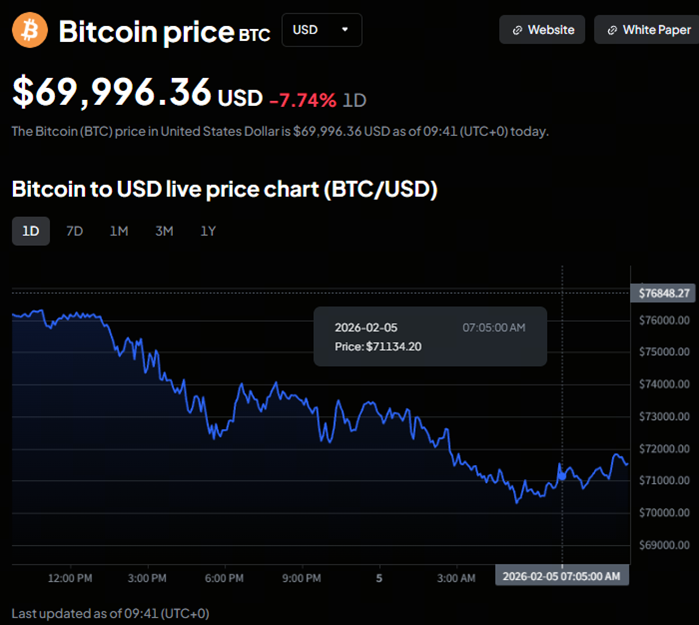 Когда рынки начинают закладывать ужесточение условий, Bitcoin ведёт себя как актив роста, а не как защитный инструмент. Он стремительно падает, а не постепенно снижается. На этой неделе вновь проявилась такая модель. По состоянию на 5 февраля 2026 года, 09:41 (UTC), цена BTC опустилась ниже $70 000.