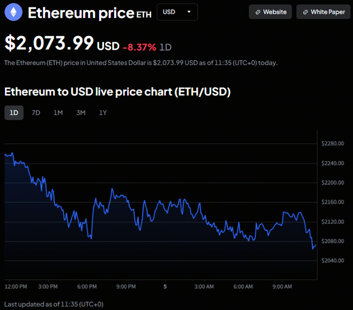 Ethereum (ETH) торговался в районе $2000 во время «распродажи», что значительно ниже пиков конца 2025 года. По состоянию на 5 февраля 2026 года, 11:35 (UTC), цена ETH опустилась до примерно $2000.