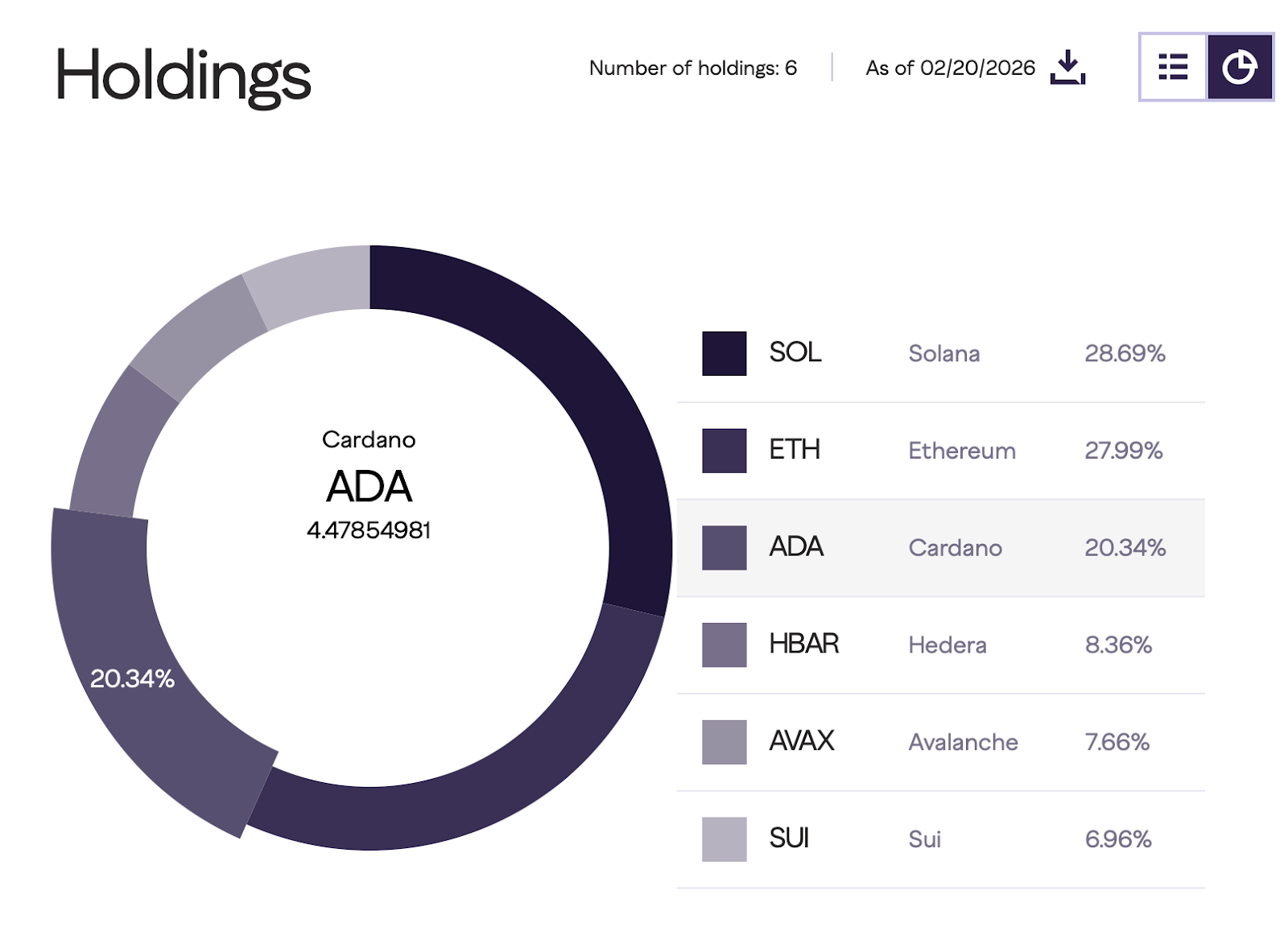 Затем следует сигнал портфелей: согласно данным фонда смарт-контрактов Grayscale, ADA занимает значимую долю в портфеле в размере 20,34% (на сегодняшний день), уступая только двум крупнейшим позициям в этом портфеле.
