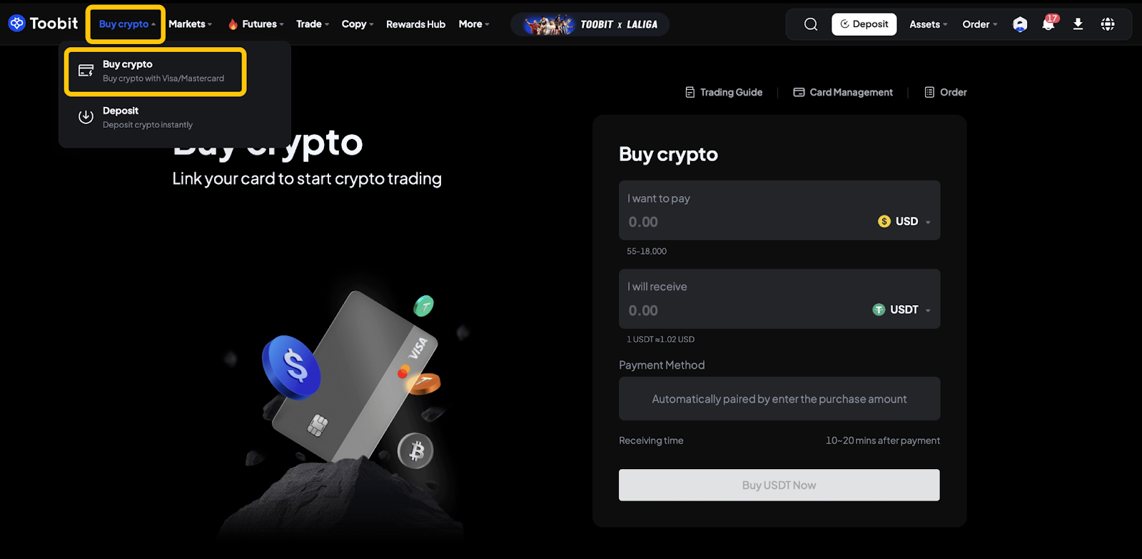 Перейдите на toobit.com, войдите в свой аккаунт и нажмите «Купить криптовалюту» в верхнем меню.