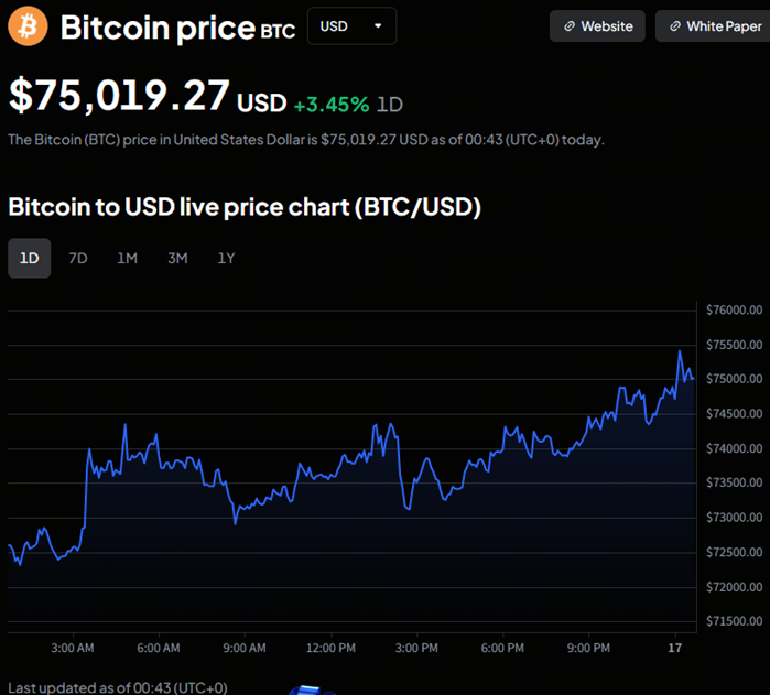 По состоянию на 17 марта 2026 года, 00:43 (UTC +0), цена BTC колеблется около $75,000, что на 8.51% больше за последние 7 дней.