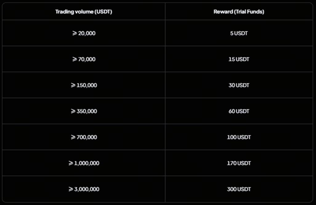 Участвуйте во всех четырех активностях, достигните объема фьючерсов свыше 50 000 USDT в каждом раунде и получите дополнительные 50 USDT в пробных средствах. Количество наград ограничено, вознаграждения распределяются в порядке очереди.