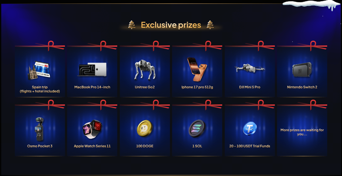 Рождественский торговый турнир от Toobit привлекает простым предложением: $1 000 000 в виде наград — от полезных призов, как iPhone 17 Pro, до поездки в Испанию (включая перелёты и проживание). Для кого-то это выглядит как праздничный розыгрыш. Для тех, кто внимательно читает мелкий шрифт, это стимул, основанный на объемах, призванный поддерживать высокую активность в нестабильный период календарного года.