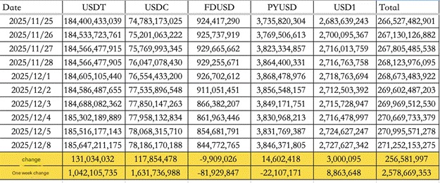 Потоки стейблкоинов укрепили ликвидность. С 1 по 8 декабря приток средств достиг $2,58 млрд, при этом USDT обеспечил $1,04 млрд, а USDC получил $1,63 млрд. Общее циркулирующее предложение сейчас составляет $271,25 млрд.