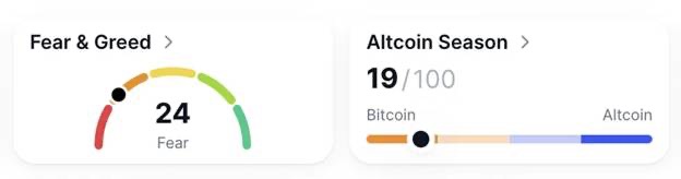 Начало сессии сопровождалось небольшим изменением динамики; доминация BTC осталась на уровне 59,41%. Настроения оставались нестабильными: индекс страха и жадности составил 24, в то время как индекс альткоинов на уровне 19 указывал на слабую ротацию относительно крупнейших криптовалют.