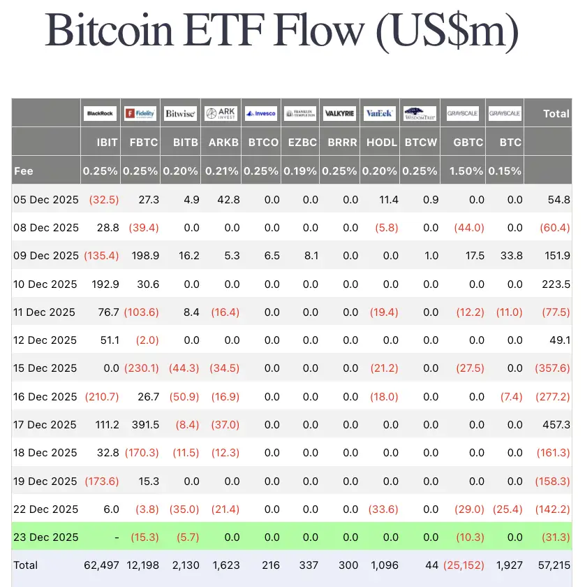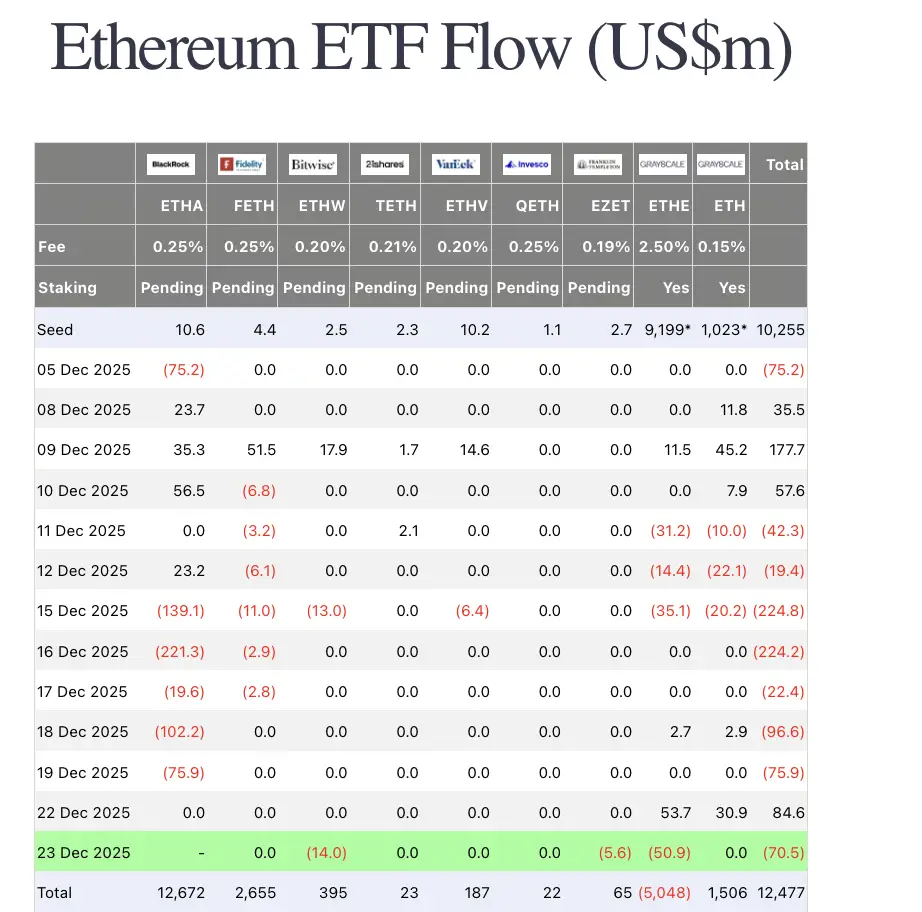 По состоянию на 23 декабря, на рынке ETF как спотовые BTC ETF, так и спотовые ETH ETF зафиксировали отток в размере $31,3 млн и $70,5 млн соответственно, при этом в сводке указано, что в этот день отсутствовали данные одного из ключевых эмитентов. Это делает посыл сообщения более ясным, даже при том, что публикация не полностью завершена: потоки по-прежнему ориентированы на снижение риска.
