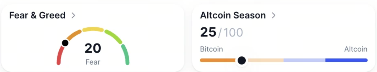 Настроения на рынке оставались настороженными. Доминация BTC сохранилась на уровне 59,42%, в то время как рыночный настрой остался полон страха: индекс страха и жадности составил 20, а индекс альткоинов зафиксировался на отметке 25.