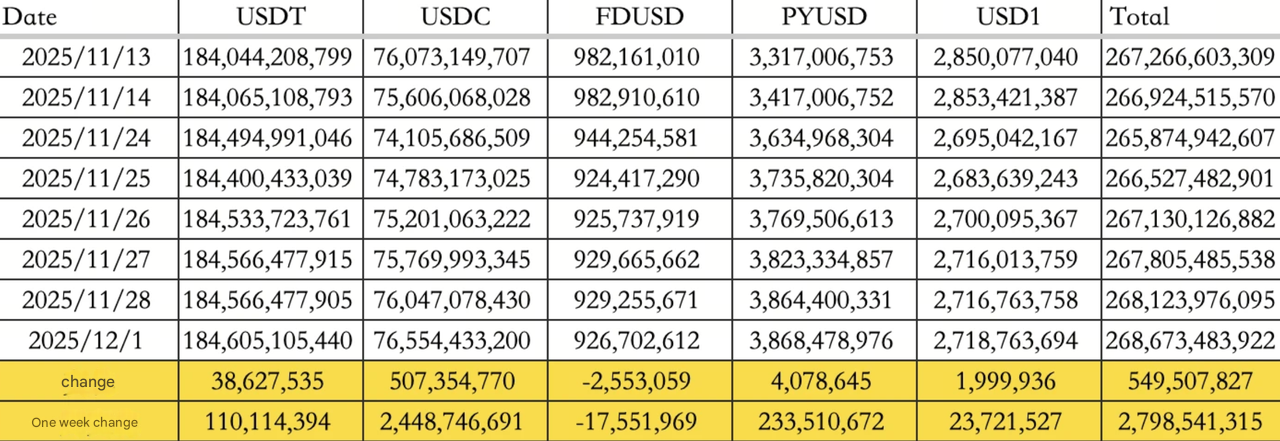 Потоки стейблкоинов продолжили поддерживать ликвидность. С 24 ноября по 1 декабря совокупный приток средств достиг $2,80 млрд, при этом приток USDT увеличился на $1,10 млн, а приток USDC возрос на $2,45 млрд. Общее циркулирующее предложение сейчас составляет $268,67 млрд.