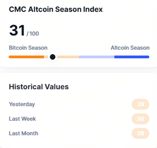 Со стороны может показаться, что на рынке царит спокойствие. Доминация Bitcoin на рынке составляет около 59%, пока индекс сезона альткоинов находится на уровне 30, согласно данным CoinMarketCap.