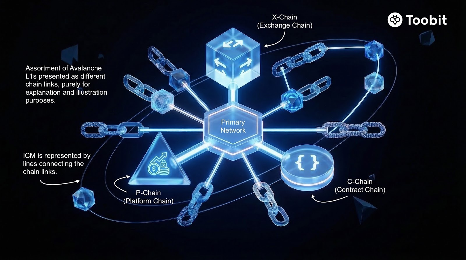 Avalanche (AVAX) работает на основе Primary Network, вокруг которой находятся настраиваемые блокчейны Avalanche Layer 1. Источник: Toobit.