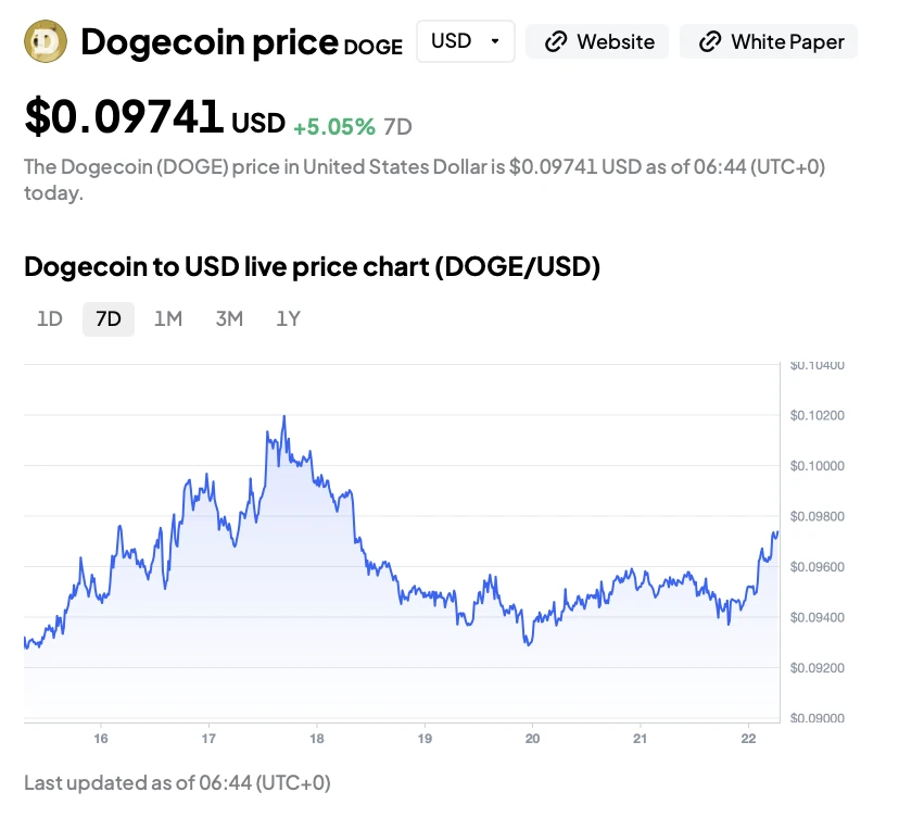 Цена DOGE сейчас находится около $0.097, увеличившись примерно на 5% за последние 7 дней. График показывает постепенный рост до области $0.10 на прошлых выходных, за которым последовал откат к $0.094. С тех пор цена стабилизировалась и снова движется к верхней границе диапазона.