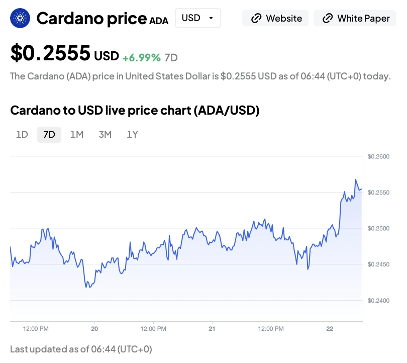 Цена ADA сейчас около $0.255, увеличившись почти на 7% за последние 7 дней. График показывает постепенный устойчивый рост, при этом цена недавно пробила уровень $0.25 после нескольких тестов. В отличие от резких скачков, такой постепенный подъем говорит о устойчивом накоплении, а не о краткосрочной спекуляции.