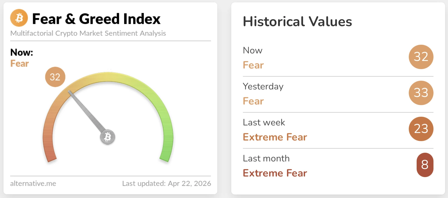 Рынки торгуются в странной смеси осторожности и тихого накопления в этом апреле. Настроения розничных инвесторов остаются сдержанными, при этом Индекс страха и жадности немного улучшился до значения Страх (32), однако данные блокчейна указывают на агрессивное позиционирование крупных держателей.