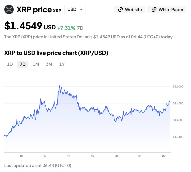 Цена токена XRP сейчас торгуется около $1.45, увеличившись примерно на 7.3% за последние 7 дней. График показывает сильный рывок на прошлых выходных к области $1.50, за которым последовал контролируемый откат и стабилизация выше зоны $1.40.