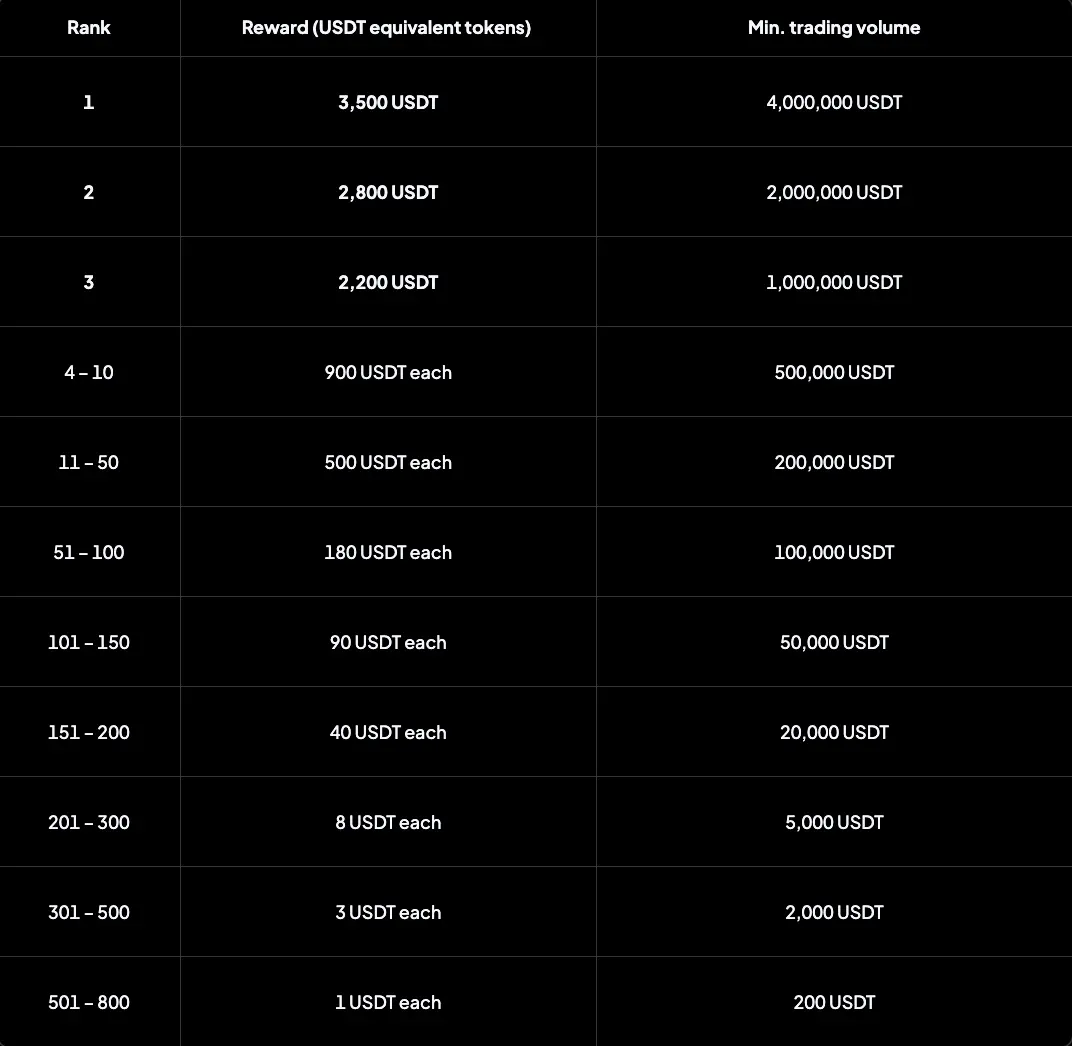 Для любителей здоровой конкуренции платформа предлагает таблицу лидеров, где участники получают награды за успехи в увеличении объёма торгов. Совершайте сделки на сумму 200 USDT или более, чтобы занять место среди топ-800 трейдеров и получить награды до 3500 USDT.