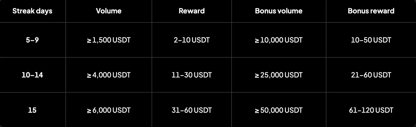 Последовательность приносит свои плоды. Достигайте определенного дневного объёма в течение 5 или более дней подряд и получайте награды в зависимости от длительности серии.