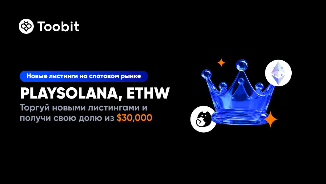 PLAYSOLANA, ETHW официально появились на Toobit, и мы отмечаем это событие по-крупному. Присоединяйтесь к нашей эксклюзивной торговой кампании и получите свою долю из призового фонда в размере $30,000, включая 10,000 USDT в бонусах и $20,000 в токенах airdrop.