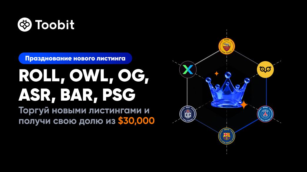 ROLL, OWL, OG, ASR, BAR и PSG теперь доступны на Toobit, и мы отмечаем это событие по-крупному. Присоединяйтесь к нашему эксклюзивному торговому событию и участвуйте в розыгрыше призового фонда в $30 000, а также 10 000 USDT в бонусах и $20 000 в виде аирдропа токенов.