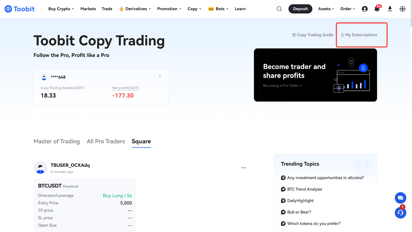 В Веб версии::- Перейдите на страницу «Копирование торговли» и нажмите на «Мои подписки».