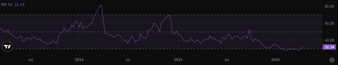 14-периодный индекс относительной силы (RSI) для APT составляет около 32.24, что сохраняет слабый импульс и близость к зоне перепроданности, а не явное восстановление. Это соответствует рынку, стабилизировавшемуся на низкой базе, но еще не показавшему более сильного восходящего движения.