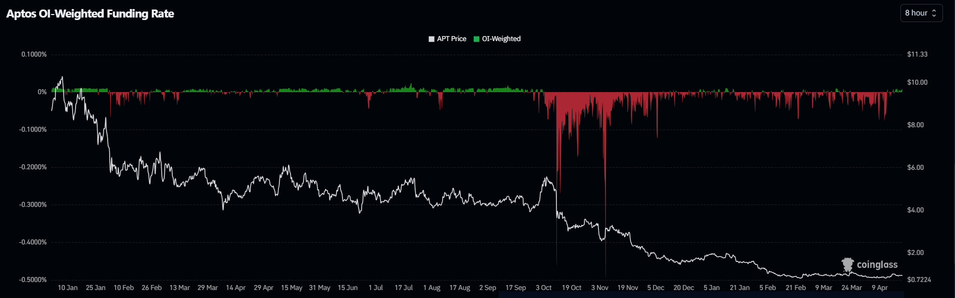 OI-взвешенная ставка финансирования APT с Coinglass по состоянию на 22 апреля 2026 года, около 07:30 UTC.