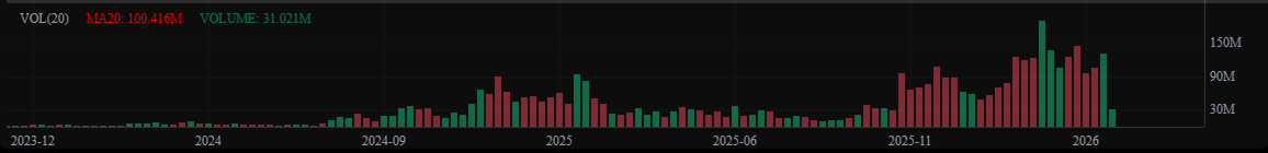Цена удерживается выше недавней базы, но все еще ниже 25-дневной MA на $1.447 и значительно ниже 99-дневной MA на $5.290. Это сохраняет движение в режиме восстановления, а не в фазе сильного тренда.