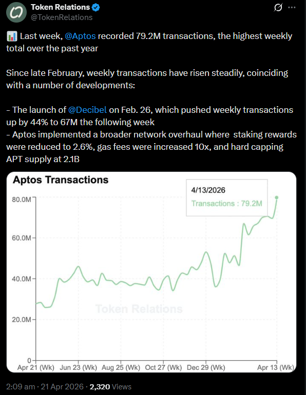 Token Relations сообщил, что Aptos достиг 79.2 миллиона еженедельных транзакций — это самый высокий показатель за последний год, и связал этот рост с запуском Decibel и обновлением токеномики сети.