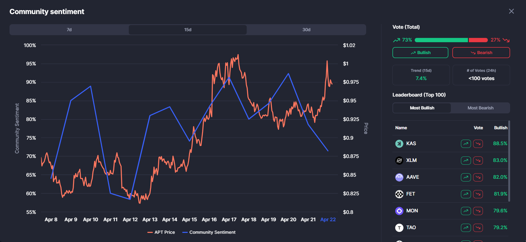Настроения сообщества по APT с CoinMarketCap по состоянию на 22 апреля 2026 года.