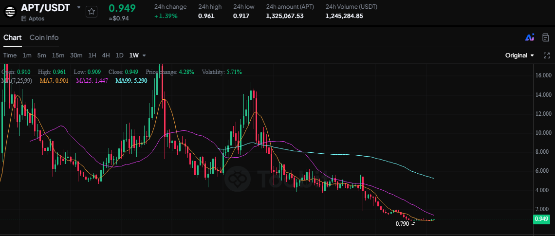 APT торгуется около нижней границы своей более широкой структуры, при этом последний 24-часовой диапазон находится между $0.9169 и $0.9618. Цена все еще держится выше недавнего минимума около $0.7897, но остается ниже первого локального потолка и значительно ниже зоны пробоя на более высоком таймфрейме.