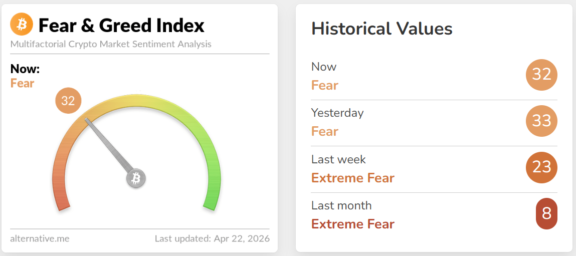 Индекс страха и жадности показывает значение 32 (Страх), что сохраняет общий настрой рынка оборонительным, а не поддерживающим чистое движение «риск-он». Прорывы все еще требуют более сильного подтверждения, а отскоки могут быстро угаснуть, если уверенность останется слабой.