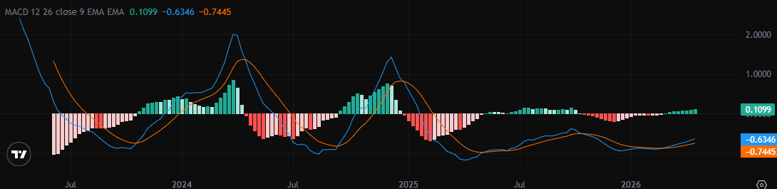 Индикатор MACD (схождение/расхождение скользящих средних) все еще ниже нуля: MACD около -0.6346, сигнальная линия около -0.7445, а гистограмма около 0.1099. Это указывает на ослабление нисходящего давления, но движение все еще выглядит как попытка восстановления, а не чистое изменение тренда.