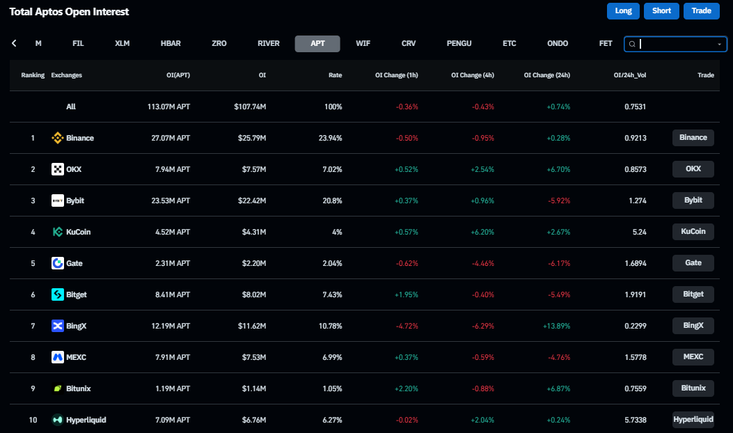 Позиционирование на деривативах остается активным, но пока не подтверждает более сильное движение. Для APT это делает отскок малоконвикционным, а не полностью поддержанным.