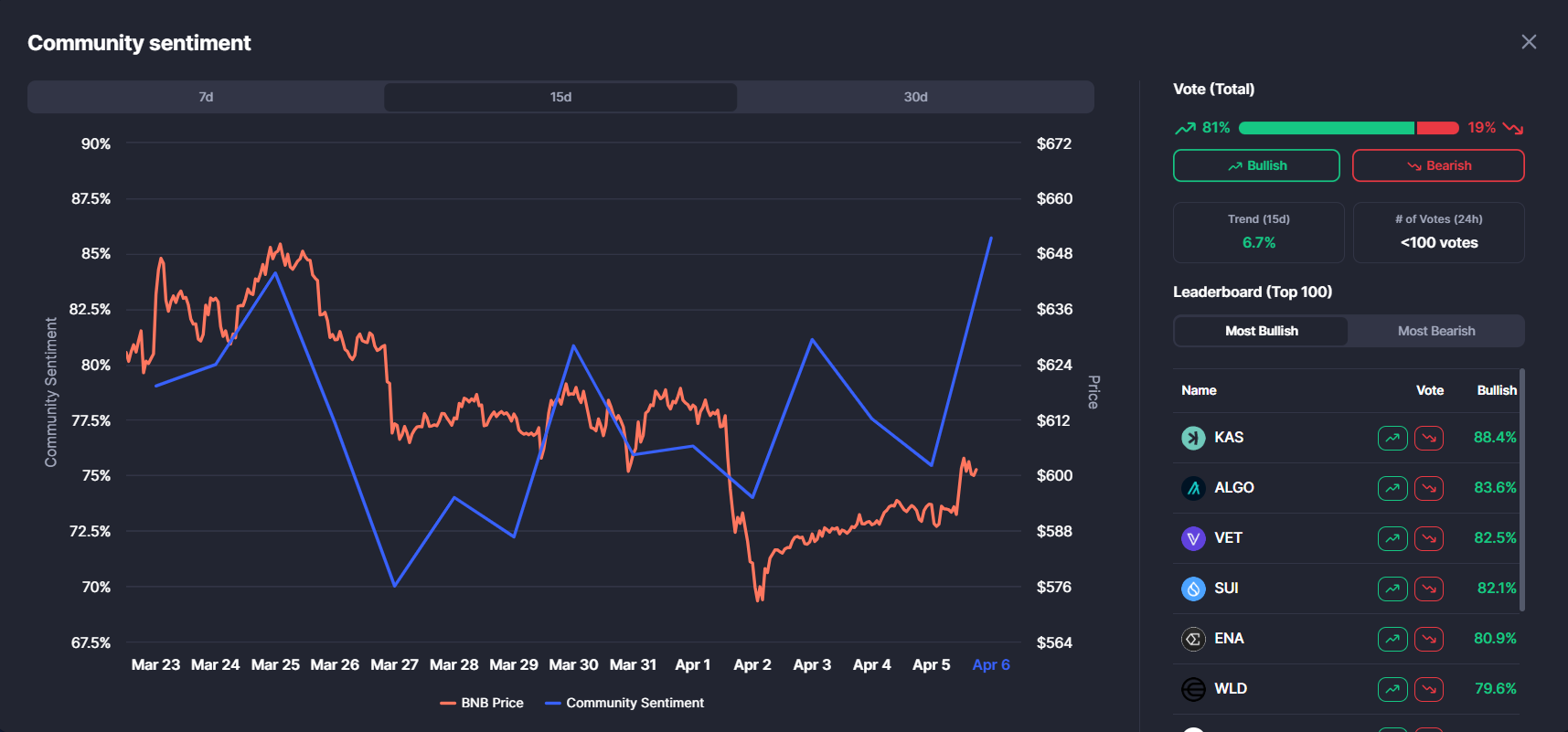 На 6 апреля 2026 года настроения на CoinMarketCap распределились следующим образом: 81% бычьих против 19% медвежьих, при тренде за 15 дней 6,7% и <100 голосах за последние 24 часа. Это поддерживает направленный сигнал, но голосов все еще мало, и их недостаточно, чтобы выразить уверенность.