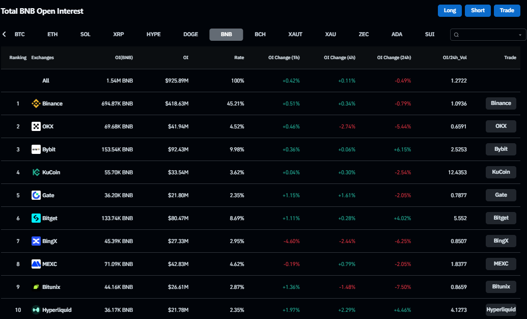 Общий открытый интерес (OI) составляет около 1,54 млн BNB (около $925,89 млн). Краткосрочные изменения смешанные: OI вырос примерно на 0,42% (1 час), поднялся примерно на 0,11% (4 часа) и снизился примерно на 0,49% (24 часа).